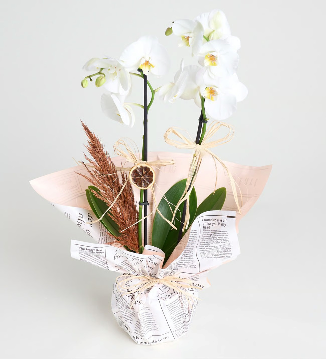Ürün İsmi: Gazete Buket Kağıtlı Saksıda Beyaz Çiftli Orkide