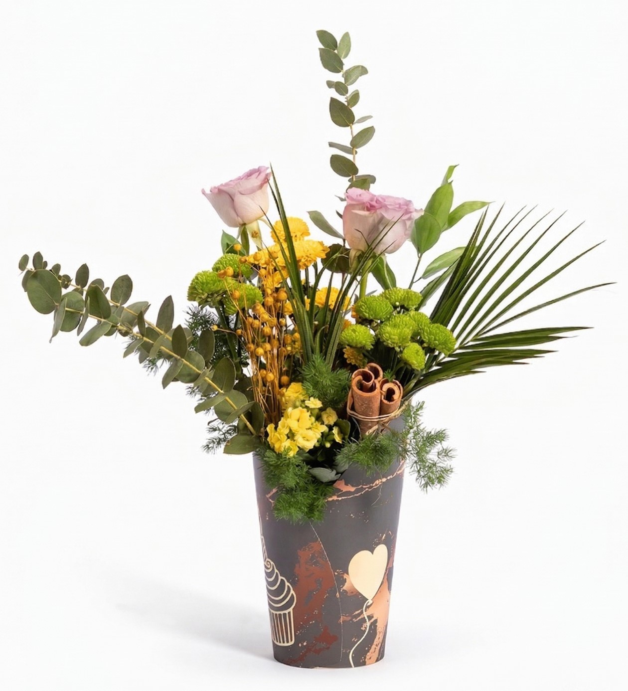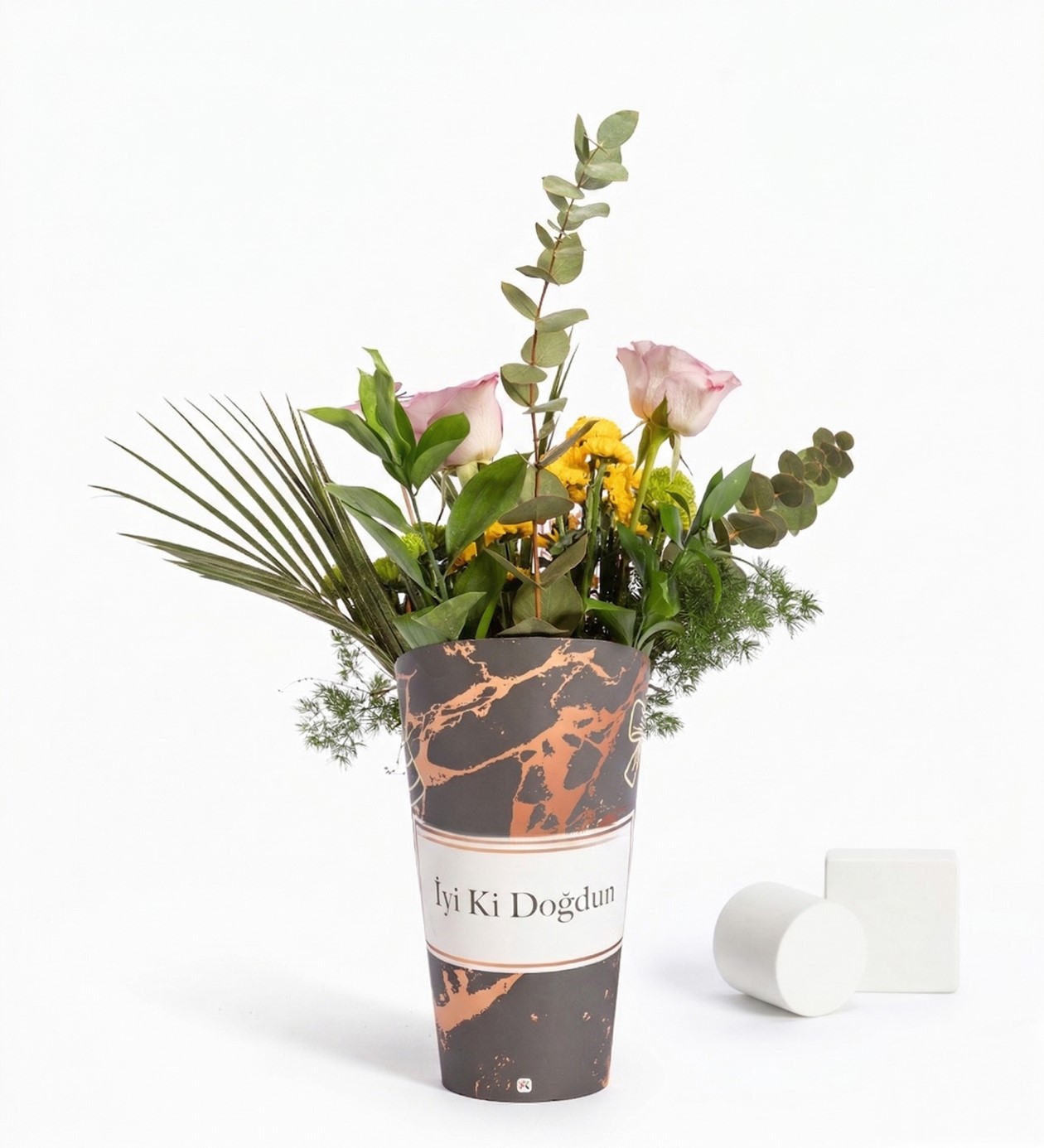 Tekli Lila Gül : 2 AdetKalanchoe Sarı (5,5 cm)-Mini : 1 AdetSarı Top Krizantem : 10 AdetYeşil Top Krizantem : 10 Adet